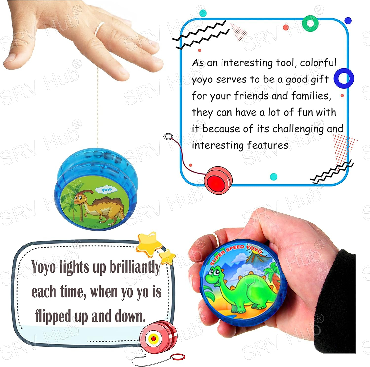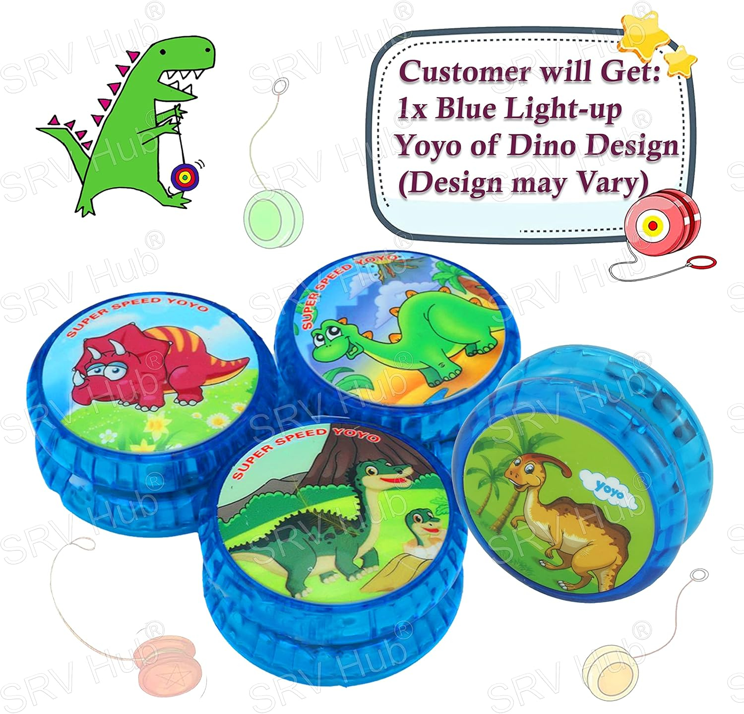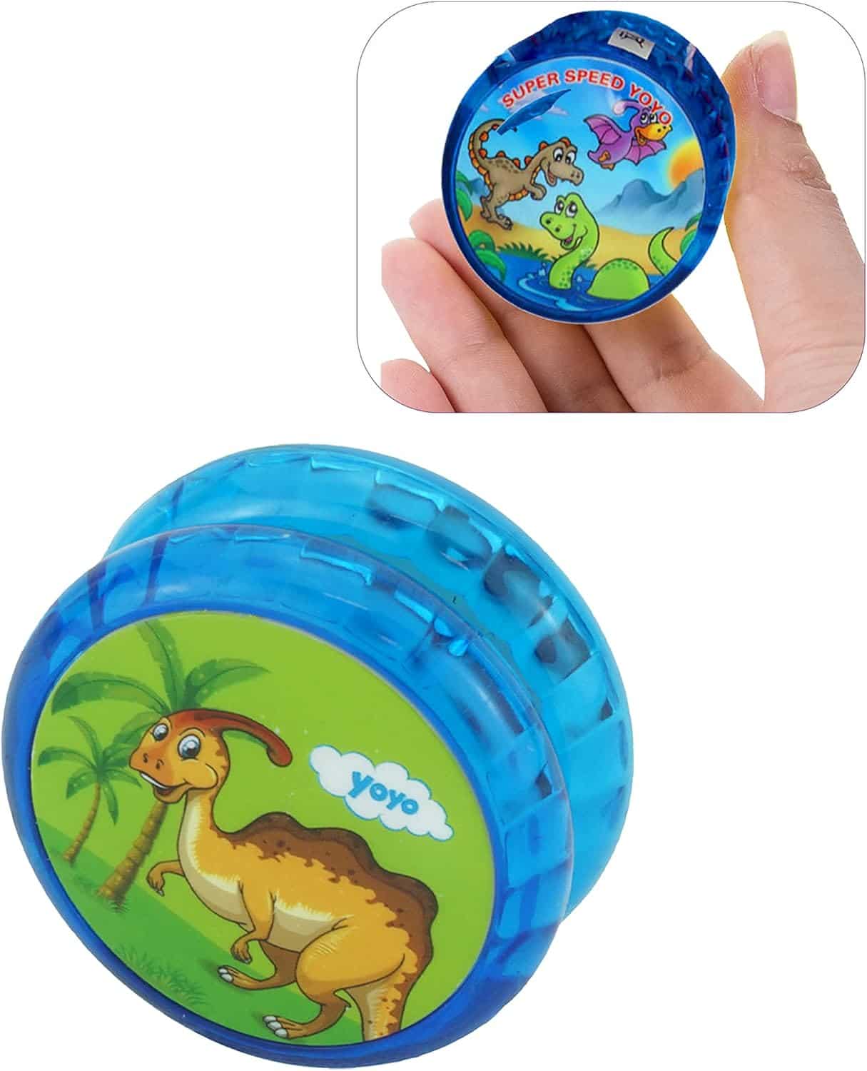 - Contenu de l’emballage : 1 yoyo lumineux dinosaure bleu avec ficelle Yoyo stable et robuste. Pile incluse.